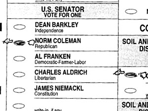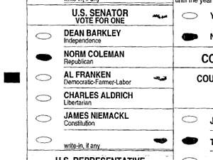 The Coleman campaign challenged this ballot from Washington County, saying the voter's intent was not clear. In several races, the voter both filled in the oval next to the candidate and drew another oval next to the candidate's name. In the Senate race, however, the additional oval is marked next to a different candidate. (Secretary of State's Office)