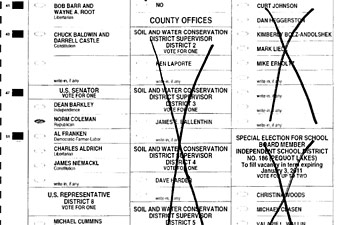 This Cottonwood County voter appears to have used white correction fluid (more commonly known as Wite-Out or Liquid Paper) to cover marks on the ballot. The Franken campaign challenged the ballot, saying the correction fluid did not constitute erasure of the underlying marks. (Secretary of State's Office)