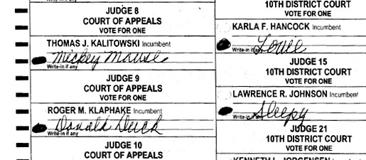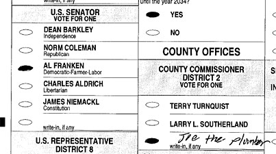 The Coleman campaign challenged this ballot from Isanti County, saying the six write-in votes for "Joe the Plumber" constituted an identifying mark on the ballot. (Secretary of State's Office)