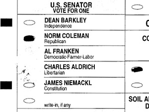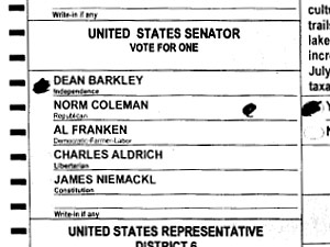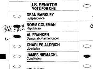 The Franken campaign challenged this Olmsted County ballot because marks from the reverse side of the ballot appear to have bled through to the front side. (Secretary of State's Office)