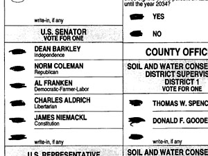 The Franken campaign challenged this Cass County ballot because of the large "X" marks crossing out all but three of the races on the ballot. (Secretary of State's Office)