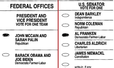 The Coleman campaign challenged a group of ballots in Fillmore County on grounds of voter intent. This ballot, representative of the group, shows a vote for John McCain for president and Al Franken for U.S. Senate. The Coleman campaign disputed the ballots, saying the voters intended to vote for Coleman. (Secretary of State's Office)