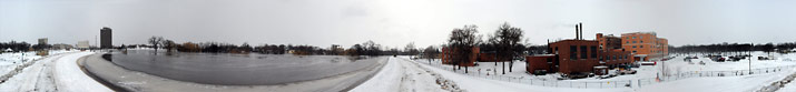 The Island Park levee in Fargo rises to a height of more than 40 feet. The River is expected to crest at 41 feet. The Red River is already reaching the clearance height of the Burlington Northern railroad and the Highway 75/Main Avenue bridges, seen here from the Moorhead shore of the river.