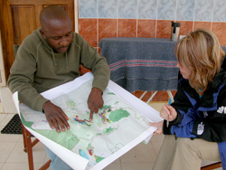 Researcher Alfred Kikote shows Kerri Miller a map of elephant migratory paths. Photo by Sasha Aslanian