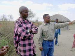 The lions killed two cattle. The villagers organized a hunting party. "Usually it's a big group of people," says Kissui. "You're talking about 200 or 300 people." The men surrounded the bushes where the lions were hiding and drove them out, killing them with spears. Lukas points to where one lion was killed and gestures that the others were killed farther away. Six lions, an entire pride including its cubs, were killed that night.