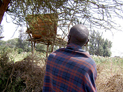 Masai farmers show the platform on the edge of thier fields where they sleep to guard against elephants. Photo by Sasha Aslanian